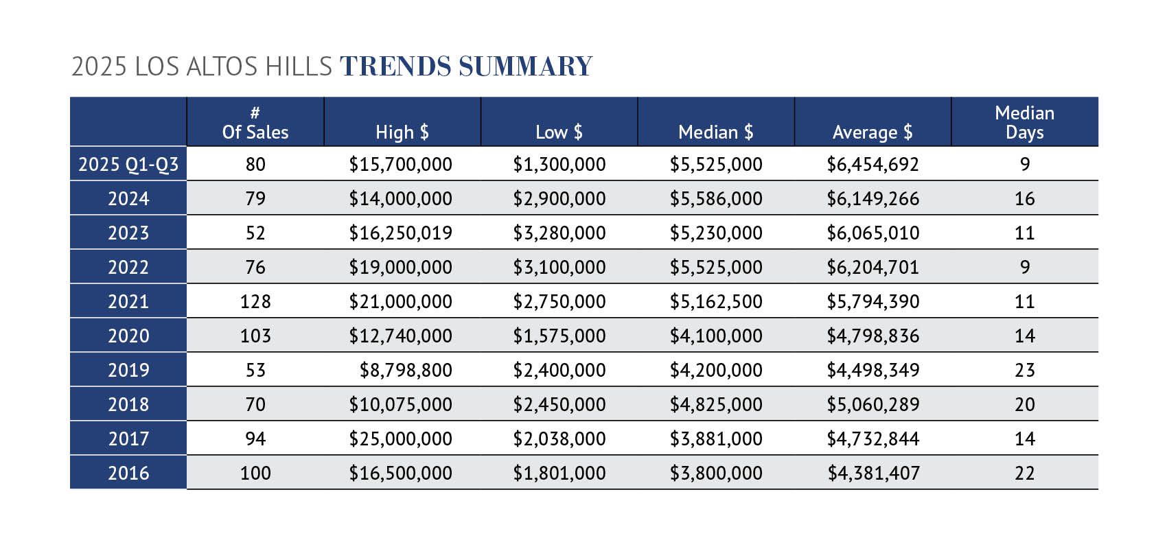 In the 3rd quarter, there were 5 homes sold for more than $10 million, 11 homes for more than $7 million, and only 4 homes that sold for less than $4 million. Of the 33 sales, 15, or 45%, sold for more than list price, including one of the most expensive sales in the quarter.