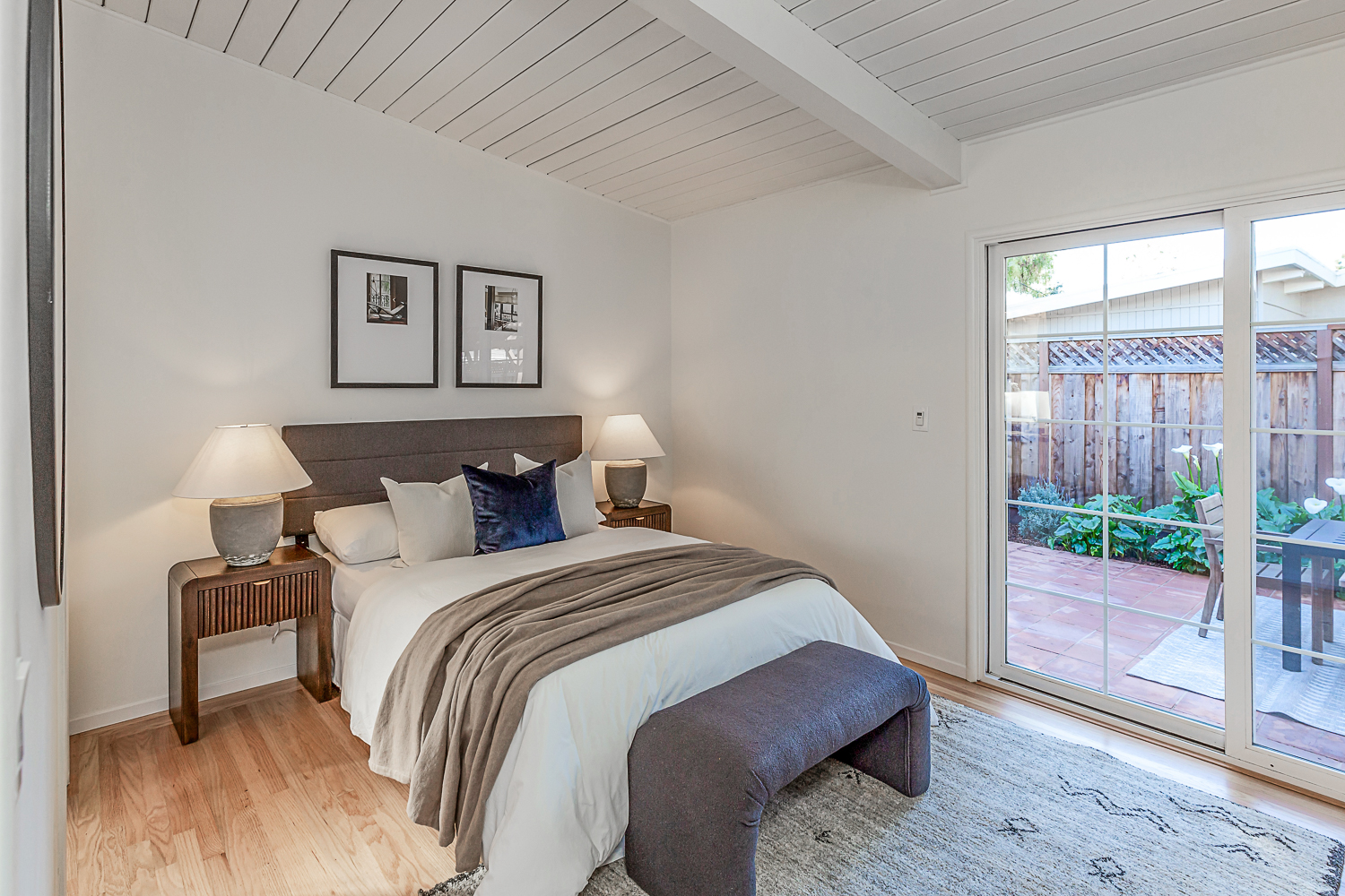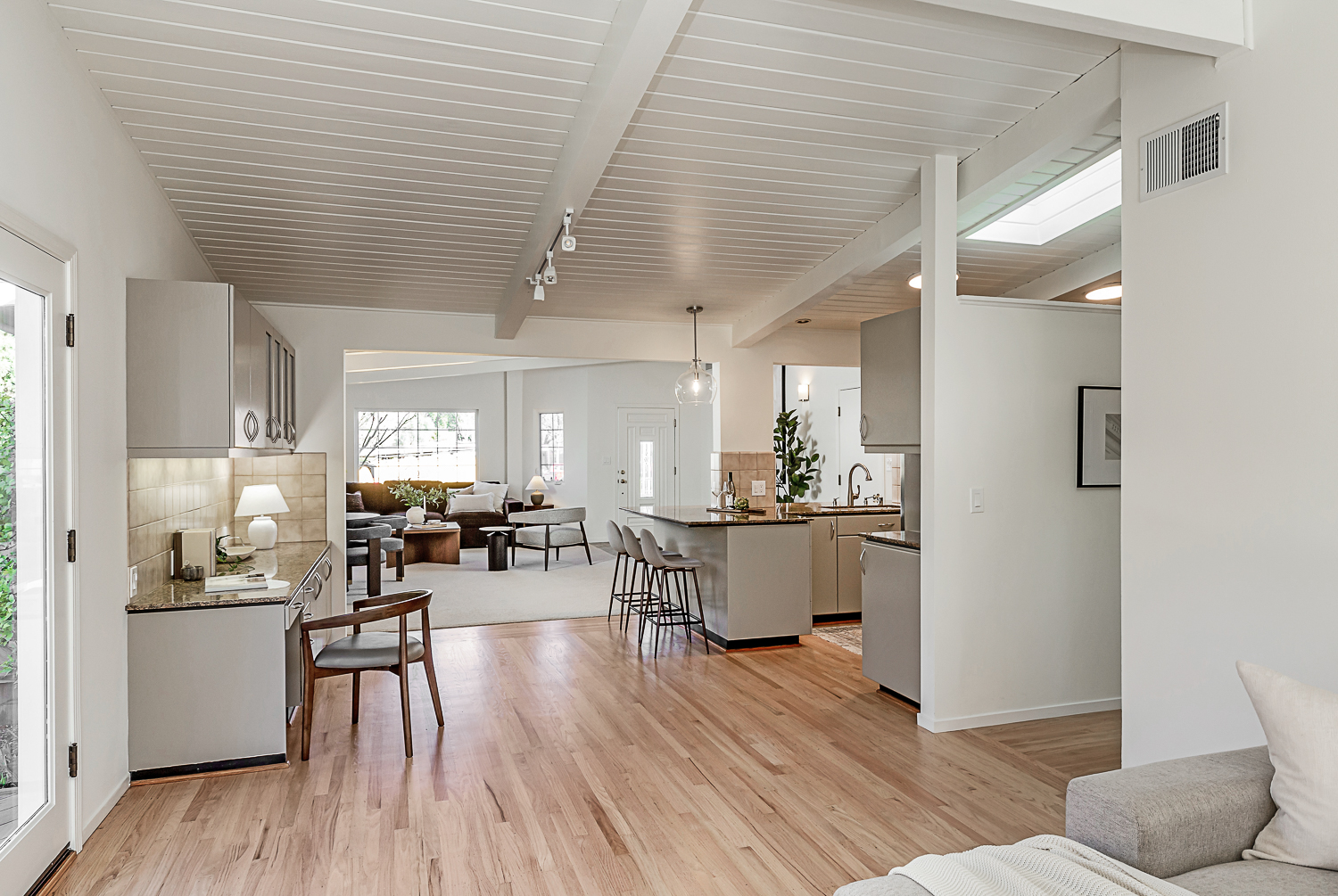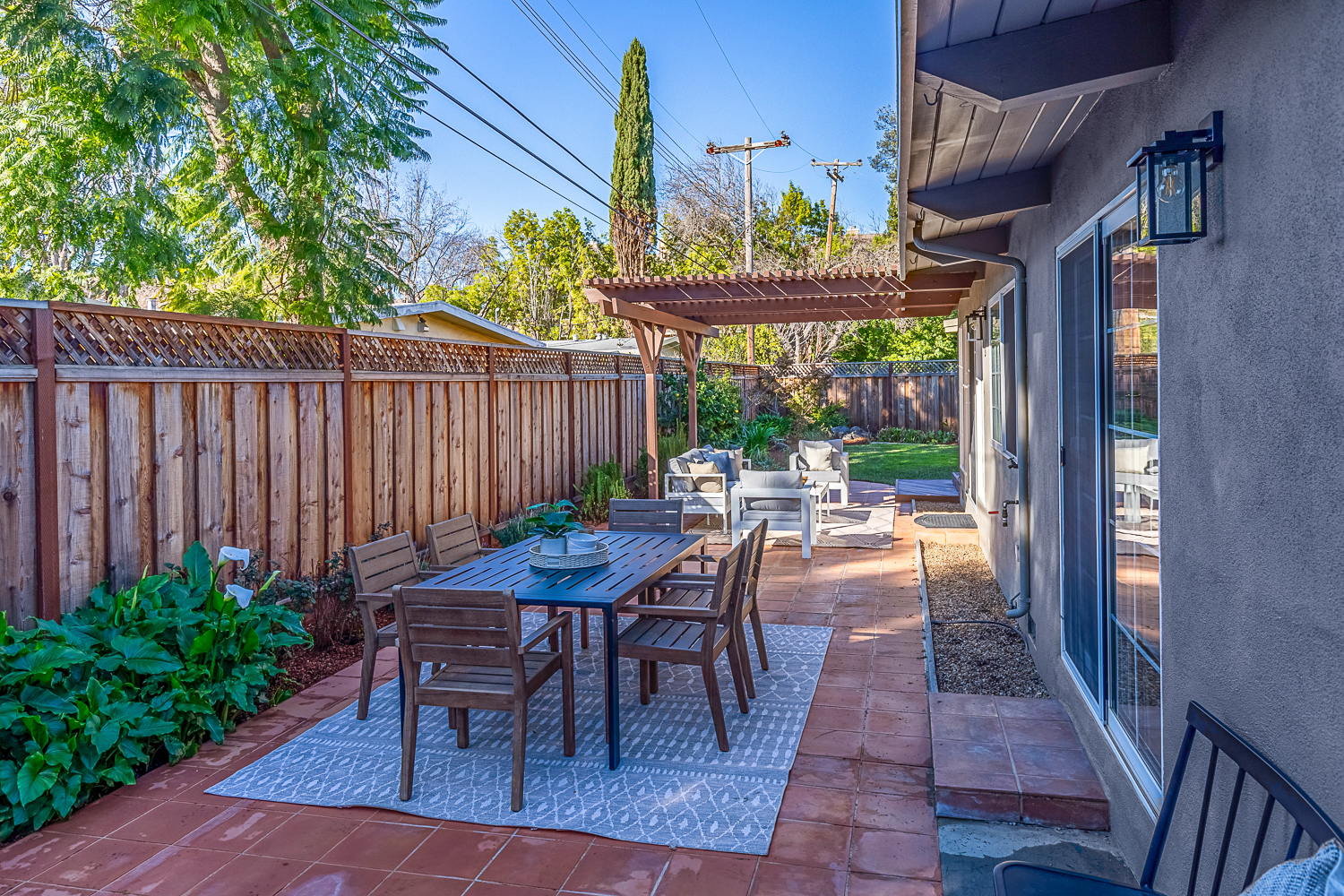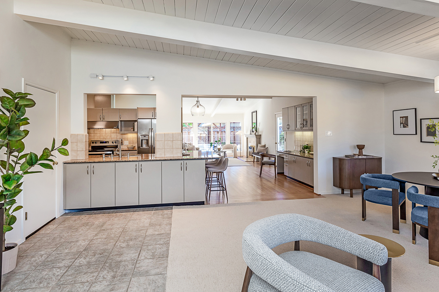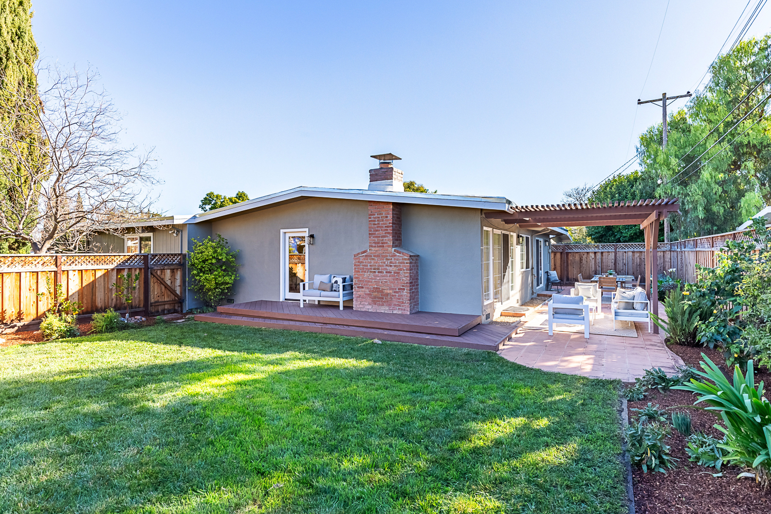 Nestled in the desirable Monta Loma neighborhood, this home boasts bright, open living spaces, privately located bedrooms, and a lovely wraparound yard. The mid-century flair lends to lofty tongue and groove ceilings, well-placed windows providing incredible natural light, gorgeous hardwood floors, and a neutral color palette ready for any style furnishings. The living/dining room combination overlooks the front of the home and enjoys direct access to the kitchen for easy entertaining. The granite-appointed chef’s kitchen offers abundant cabinetry, a vast peninsula counter with breakfast bar seating, and a built-in desk center with storage and a serving bar. At the back of the home, the fireside family room is flooded with natural light and has a wall of windows and glass doors to the yard. The primary suite opens directly to the back patio, and two additional bedrooms have easy access to the hall bath. Outside, a large deck overlooks the lush lawn and mature plantings, and an extensive terracotta tile patio has a pergola covering and a raised garden bed at one end. Ideal placement on a u-shaped street with minimal traffic. Located just minutes from Thaddeus and Monta Loma parks, major tech employers, commute routes, shopping dining, and both downtown Mountain View and Los Altos.