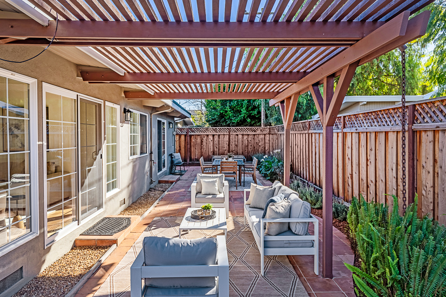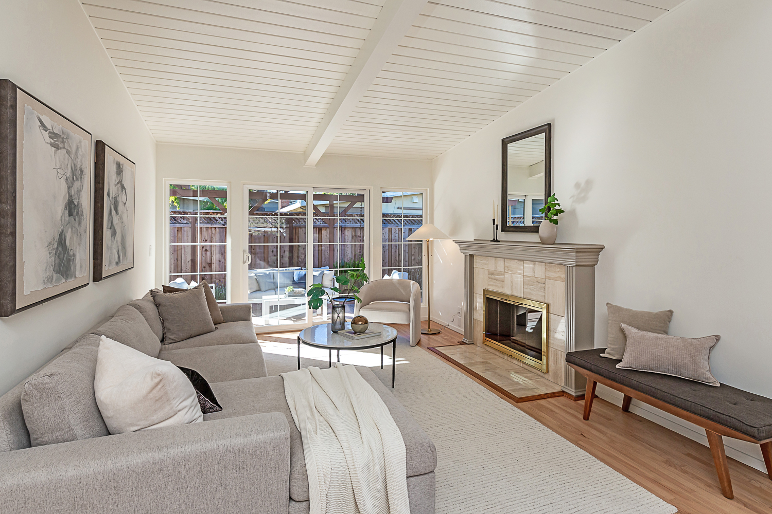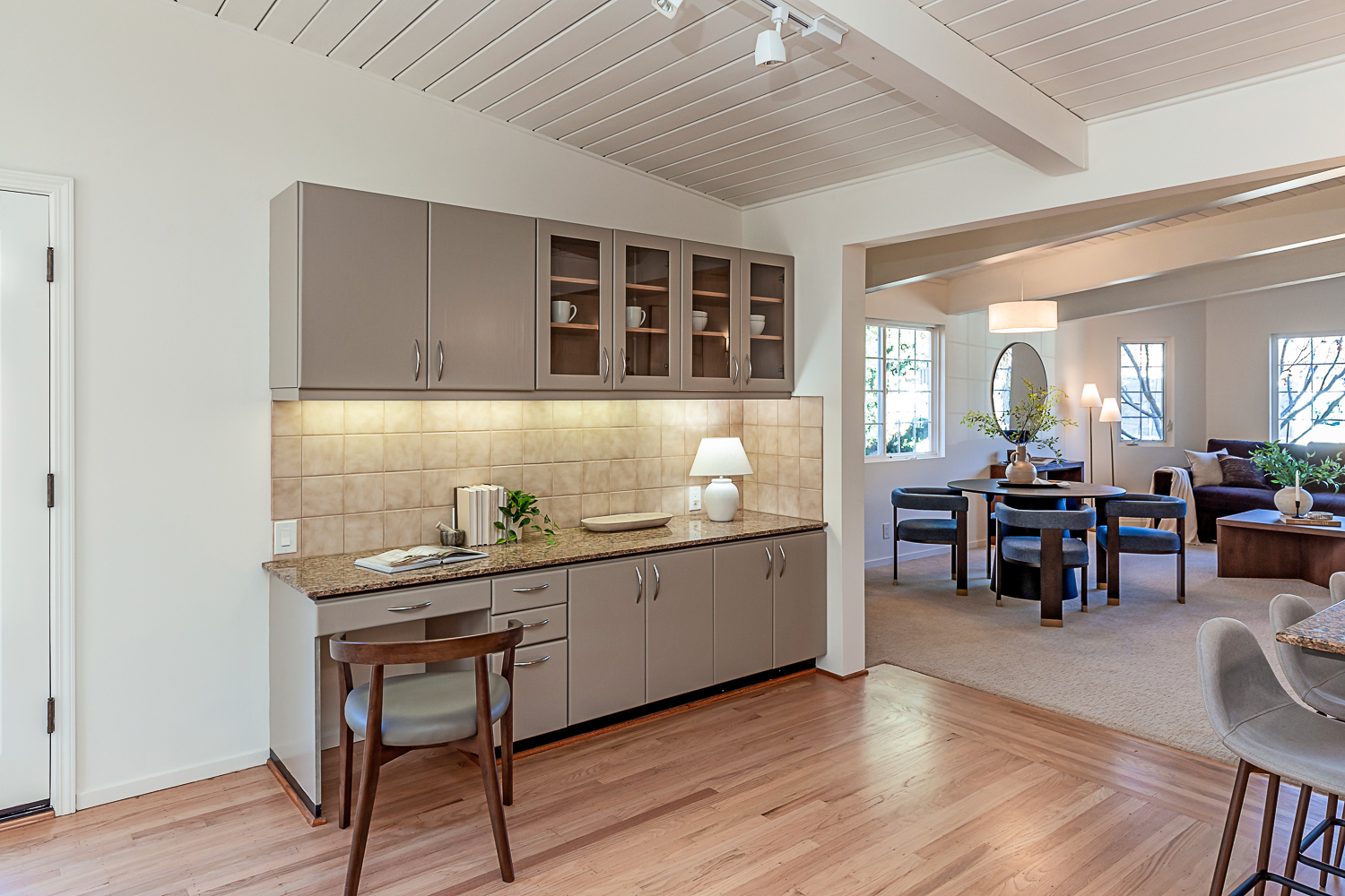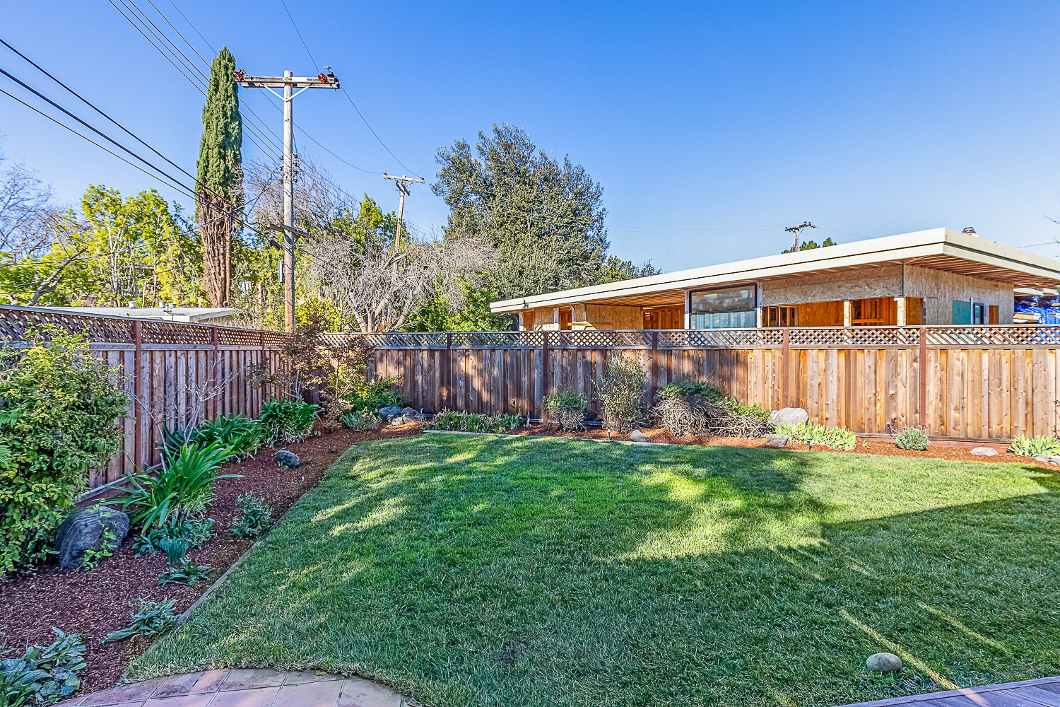 Nestled in the desirable Monta Loma neighborhood, this home boasts bright, open living spaces, privately located bedrooms, and a lovely wraparound yard. The mid-century flair lends to lofty tongue and groove ceilings, well-placed windows providing incredible natural light, gorgeous hardwood floors, and a neutral color palette ready for any style furnishings. The living/dining room combination overlooks the front of the home and enjoys direct access to the kitchen for easy entertaining. The granite-appointed chef’s kitchen offers abundant cabinetry, a vast peninsula counter with breakfast bar seating, and a built-in desk center with storage and a serving bar. At the back of the home, the fireside family room is flooded with natural light and has a wall of windows and glass doors to the yard. The primary suite opens directly to the back patio, and two additional bedrooms have easy access to the hall bath. Outside, a large deck overlooks the lush lawn and mature plantings, and an extensive terracotta tile patio has a pergola covering and a raised garden bed at one end. Ideal placement on a u-shaped street with minimal traffic. Located just minutes from Thaddeus and Monta Loma parks, major tech employers, commute routes, shopping dining, and both downtown Mountain View and Los Altos.
