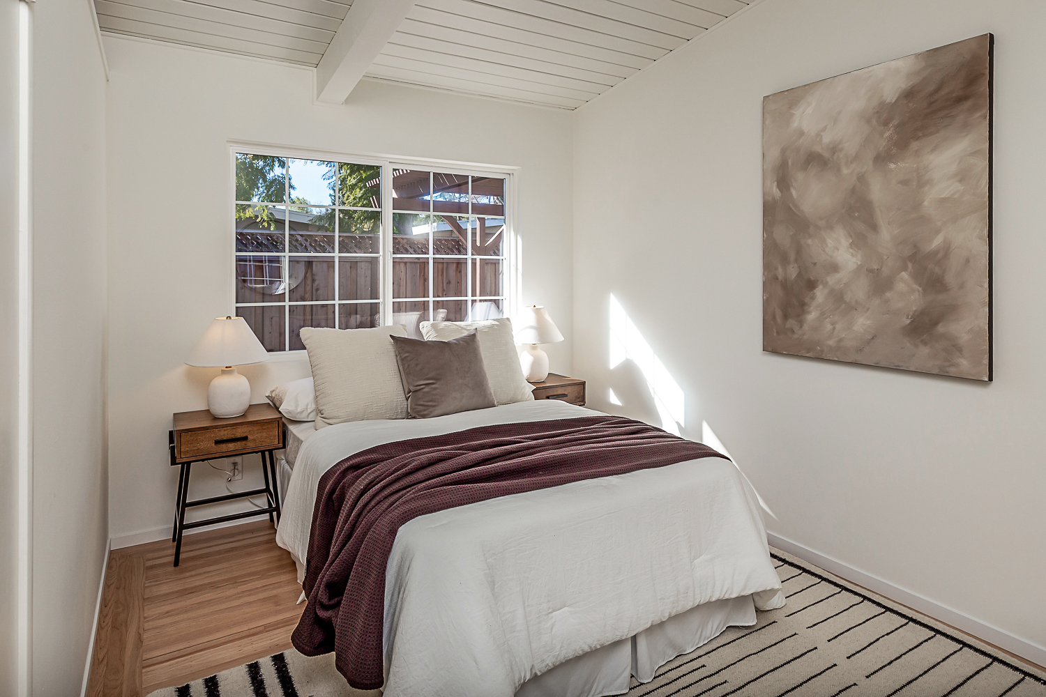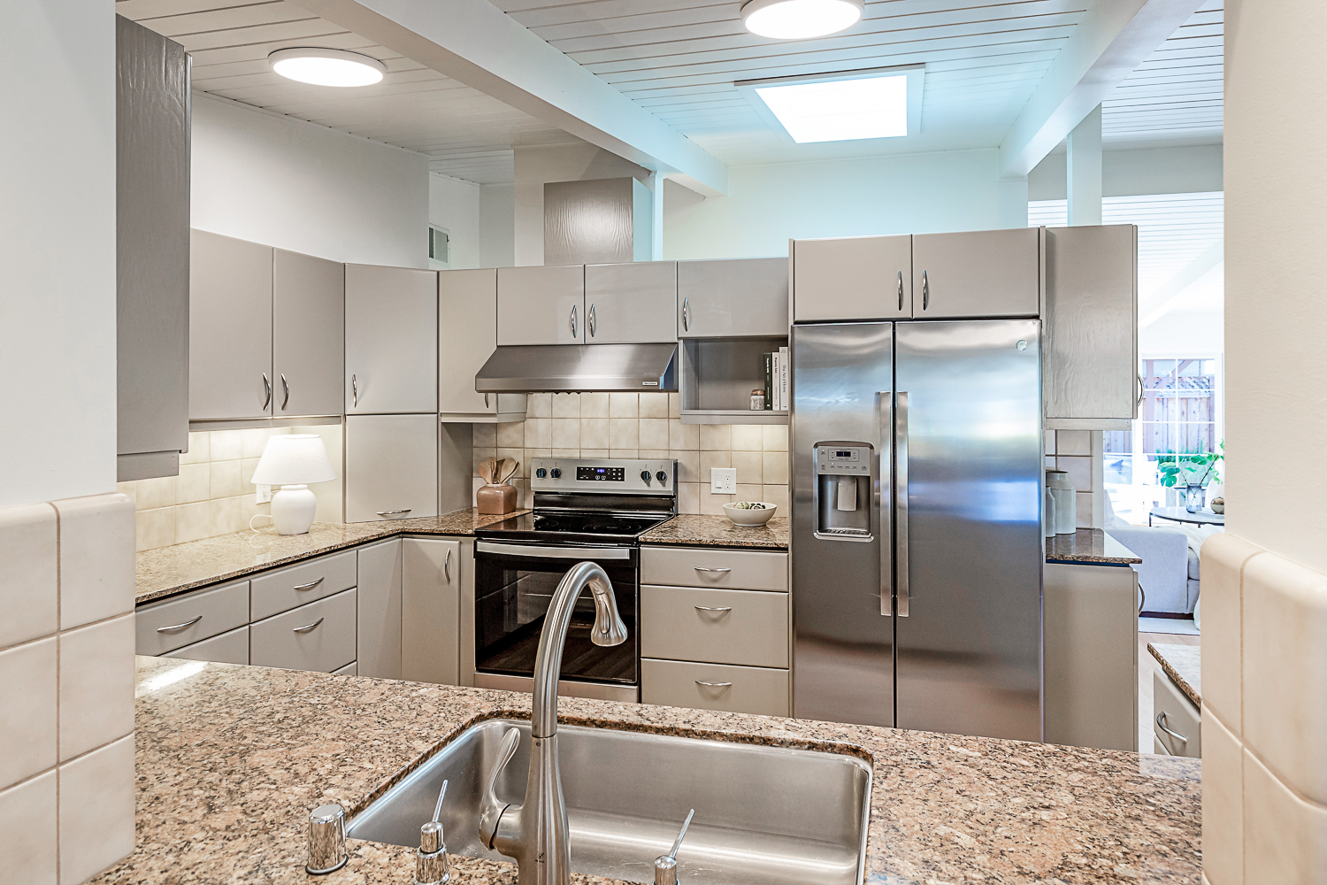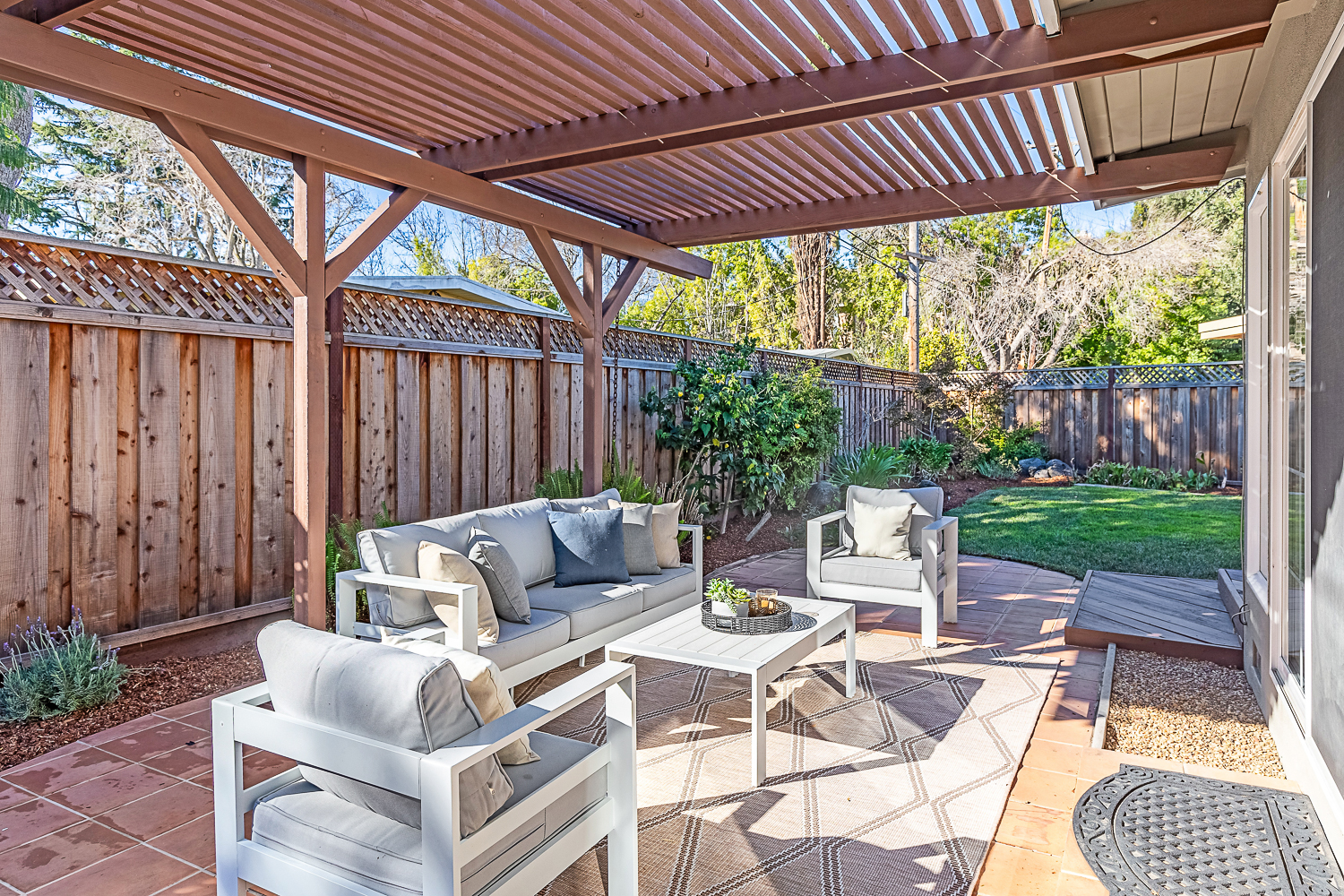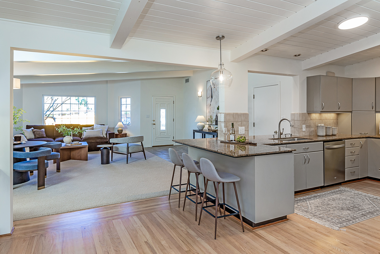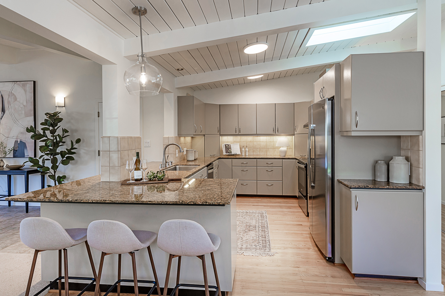 Nestled in the desirable Monta Loma neighborhood, this home boasts bright, open living spaces, privately located bedrooms, and a lovely wraparound yard. The mid-century flair lends to lofty tongue and groove ceilings, well-placed windows providing incredible natural light, gorgeous hardwood floors, and a neutral color palette ready for any style furnishings. The living/dining room combination overlooks the front of the home and enjoys direct access to the kitchen for easy entertaining. The granite-appointed chef’s kitchen offers abundant cabinetry, a vast peninsula counter with breakfast bar seating, and a built-in desk center with storage and a serving bar. At the back of the home, the fireside family room is flooded with natural light and has a wall of windows and glass doors to the yard. The primary suite opens directly to the back patio, and two additional bedrooms have easy access to the hall bath. Outside, a large deck overlooks the lush lawn and mature plantings, and an extensive terracotta tile patio has a pergola covering and a raised garden bed at one end. Ideal placement on a u-shaped street with minimal traffic. Located just minutes from Thaddeus and Monta Loma parks, major tech employers, commute routes, shopping dining, and both downtown Mountain View and Los Altos.