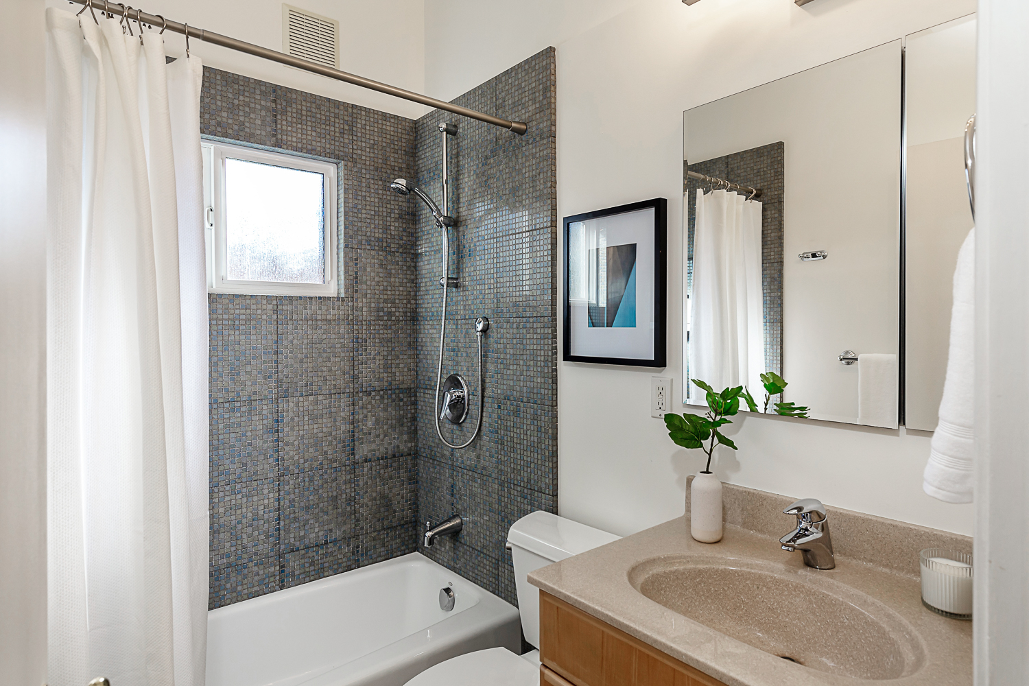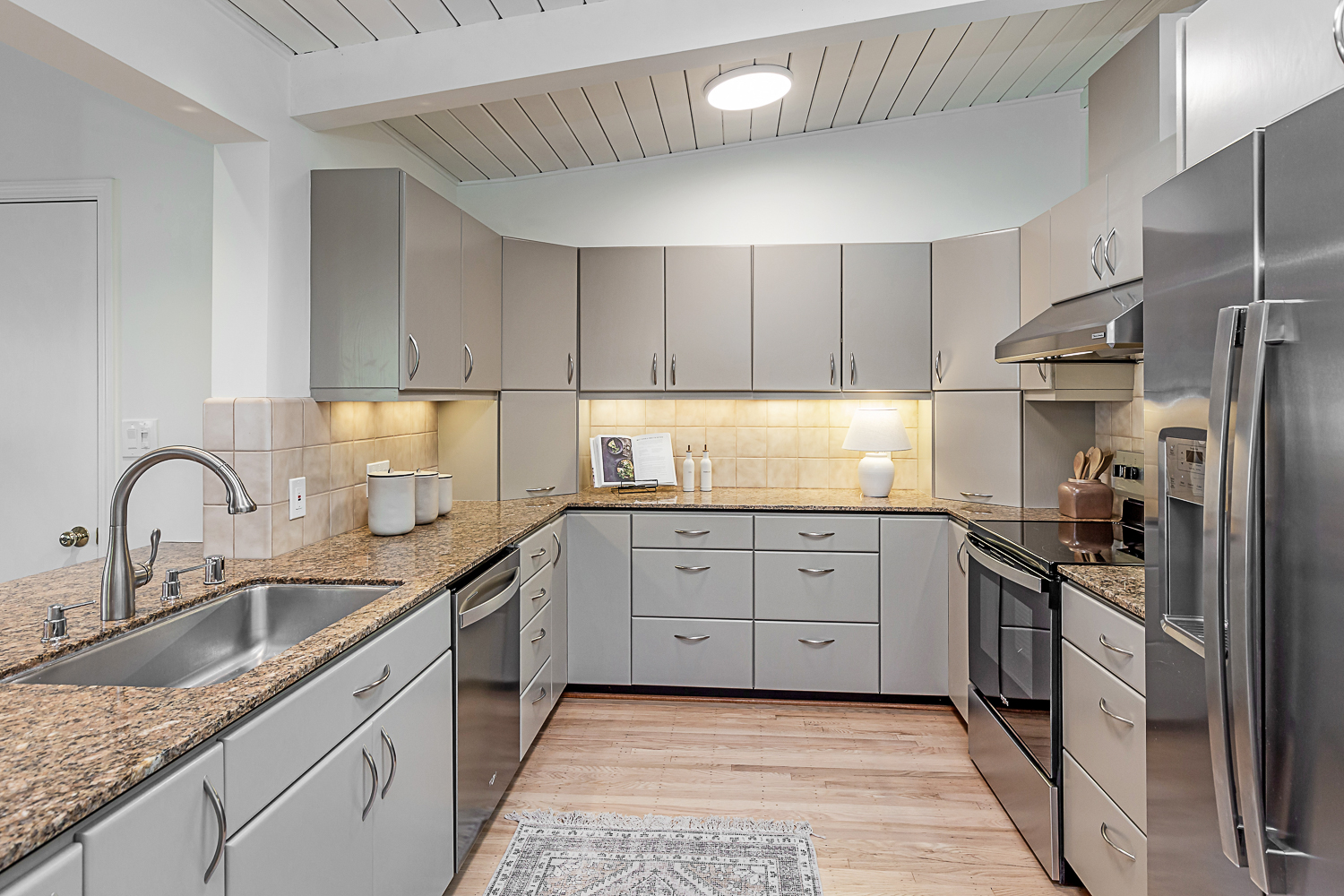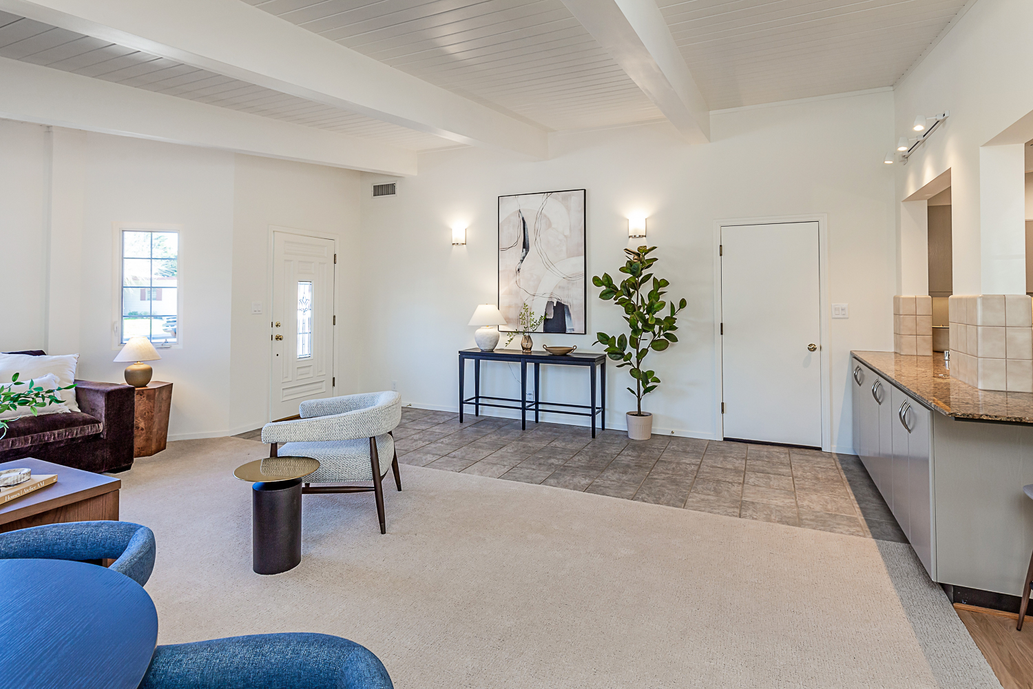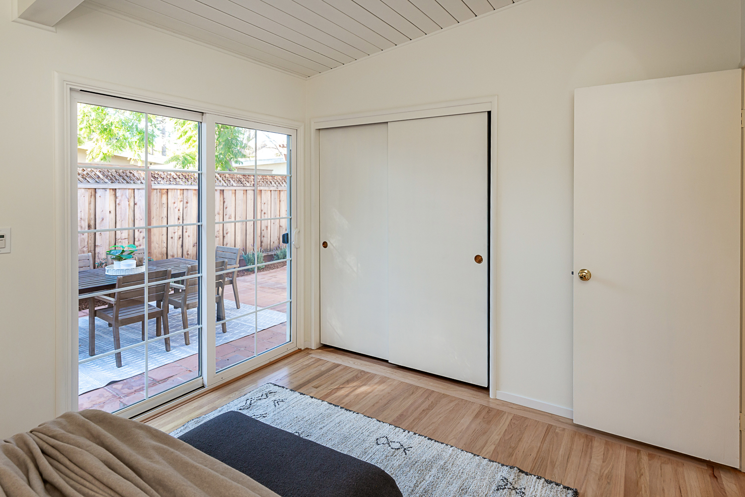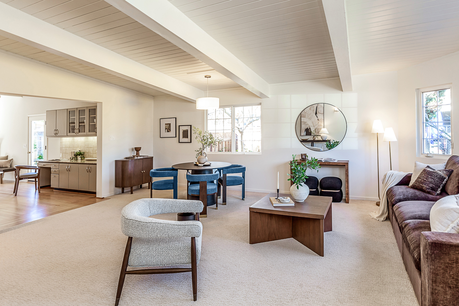Nestled in the desirable Monta Loma neighborhood, this home boasts bright, open living spaces, privately located bedrooms, and a lovely wraparound yard. The mid-century flair lends to lofty tongue and groove ceilings, well-placed windows providing incredible natural light, gorgeous hardwood floors, and a neutral color palette ready for any style furnishings. The living/dining room combination overlooks the front of the home and enjoys direct access to the kitchen for easy entertaining. The granite-appointed chef’s kitchen offers abundant cabinetry, a vast peninsula counter with breakfast bar seating, and a built-in desk center with storage and a serving bar. At the back of the home, the fireside family room is flooded with natural light and has a wall of windows and glass doors to the yard. The primary suite opens directly to the back patio, and two additional bedrooms have easy access to the hall bath. Outside, a large deck overlooks the lush lawn and mature plantings, and an extensive terracotta tile patio has a pergola covering and a raised garden bed at one end. Ideal placement on a u-shaped street with minimal traffic. Located just minutes from Thaddeus and Monta Loma parks, major tech employers, commute routes, shopping dining, and both downtown Mountain View and Los Altos.