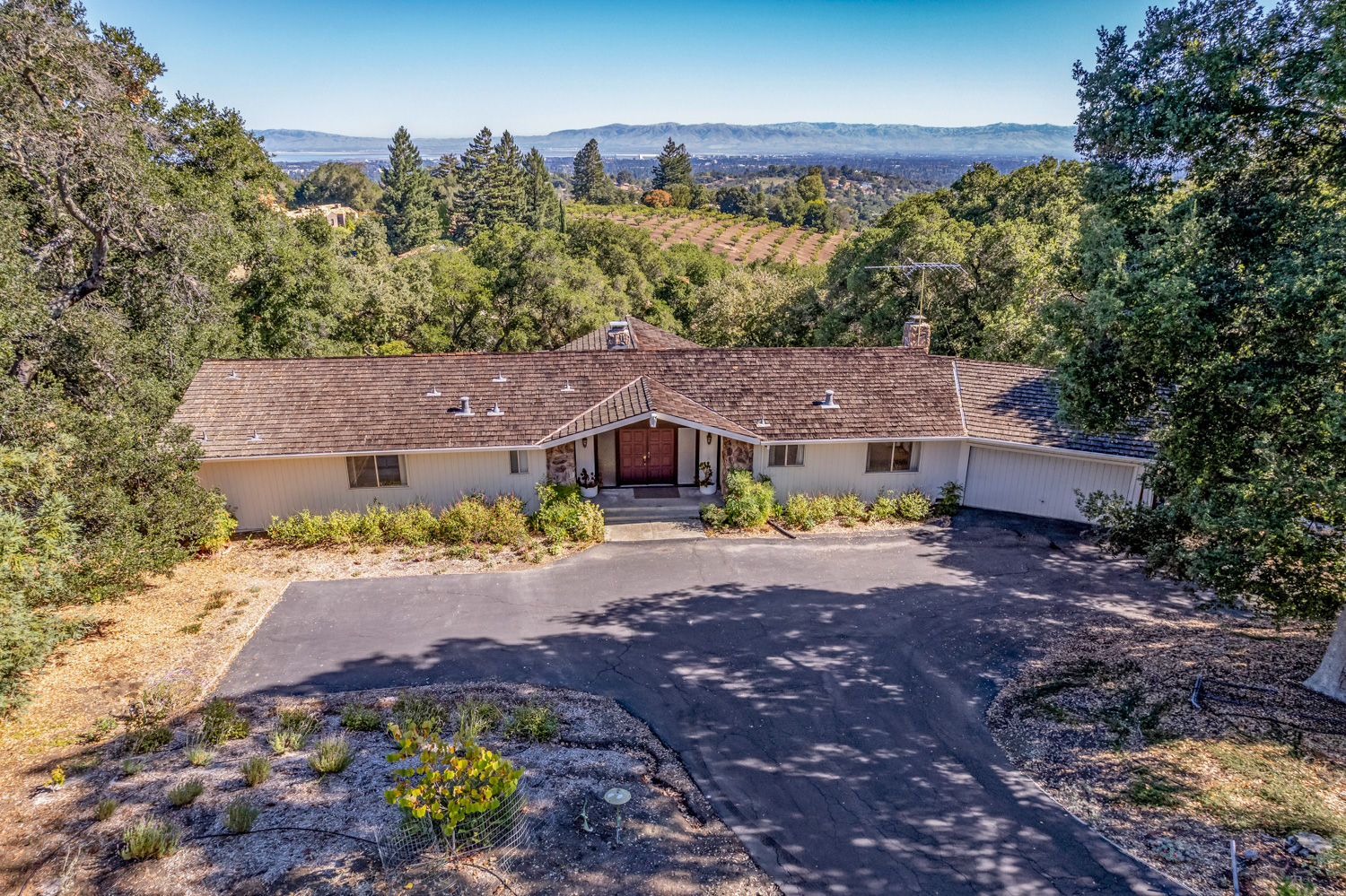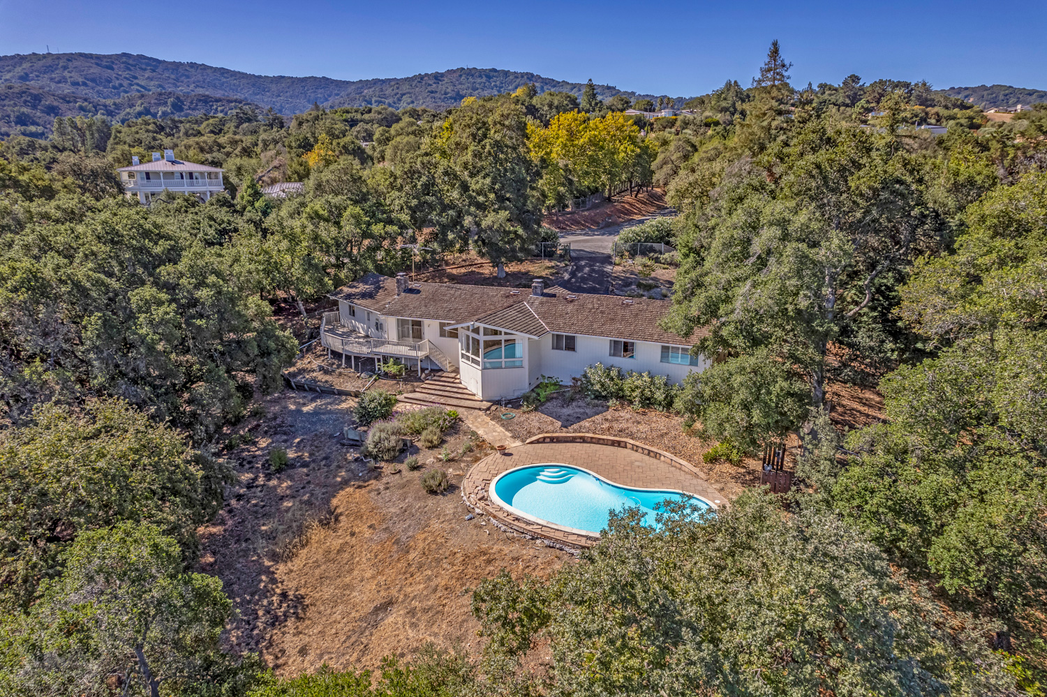 Surrounded by majestic mature trees and natural beauty, this 1.13 acre property offers the ability to build your dream home, remodel, or expand overlooking the bay. The existing 4 bedroom, 2 bath home has soaring ceilings, a spacious living room with floor-to-ceiling view windows, an extensive entertaining deck overlooking the grounds and the bay, and a fabulous single-level floor plan. The public rooms sit on one side of the home, all seamlessly connected to one another, while the bedrooms are collected in a quiet bedroom wing. Outside, a pool has a patio surround and looks out over the private property. Located in a highly sought-after pocket of the hills that provides ultimate privacy and tranquility, with the convenience of being just minutes from commute routes and downtown amenities. MFA 5,000 SF/MDA 8,528 SF. Top-rated Los Altos schools!