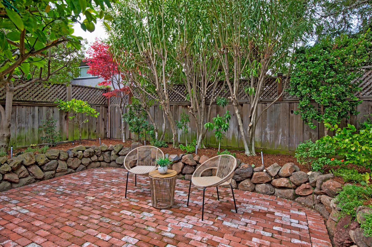 Set within a quiet and secure gated community in a prime Sunnyvale location, this stylish home combines soaring ceilings, incredible natural light, and a thoughtfully designed floor plan. A gated courtyard and covered entrance introduce the home, where rich hardwood floors extend throughout. The living room enjoys dramatic two-story ceilings, a painted brick fireplace, built-ins, and tall windows framing views of the private yard. The adjacent dining area is anchored by a two-tier drum chandelier and enjoys clerestory windows for added light, while the kitchen offers granite countertops, full-height tile backsplashes, a skylight, and quality appliances. A casual dining area opens to the lush backyard surrounded by tall perimeter trees, stacked-stone garden beds, a lovely brick patio, and a wood deck with built-in seating. Three bedrooms include the spacious primary with generous closet space and an en suite bath with dual vanities. Access to a community pool, hot tub, and barbecue area. A light and airy home with an ideal layout for family living and entertaining, moments from parks, schools, and top amenities.