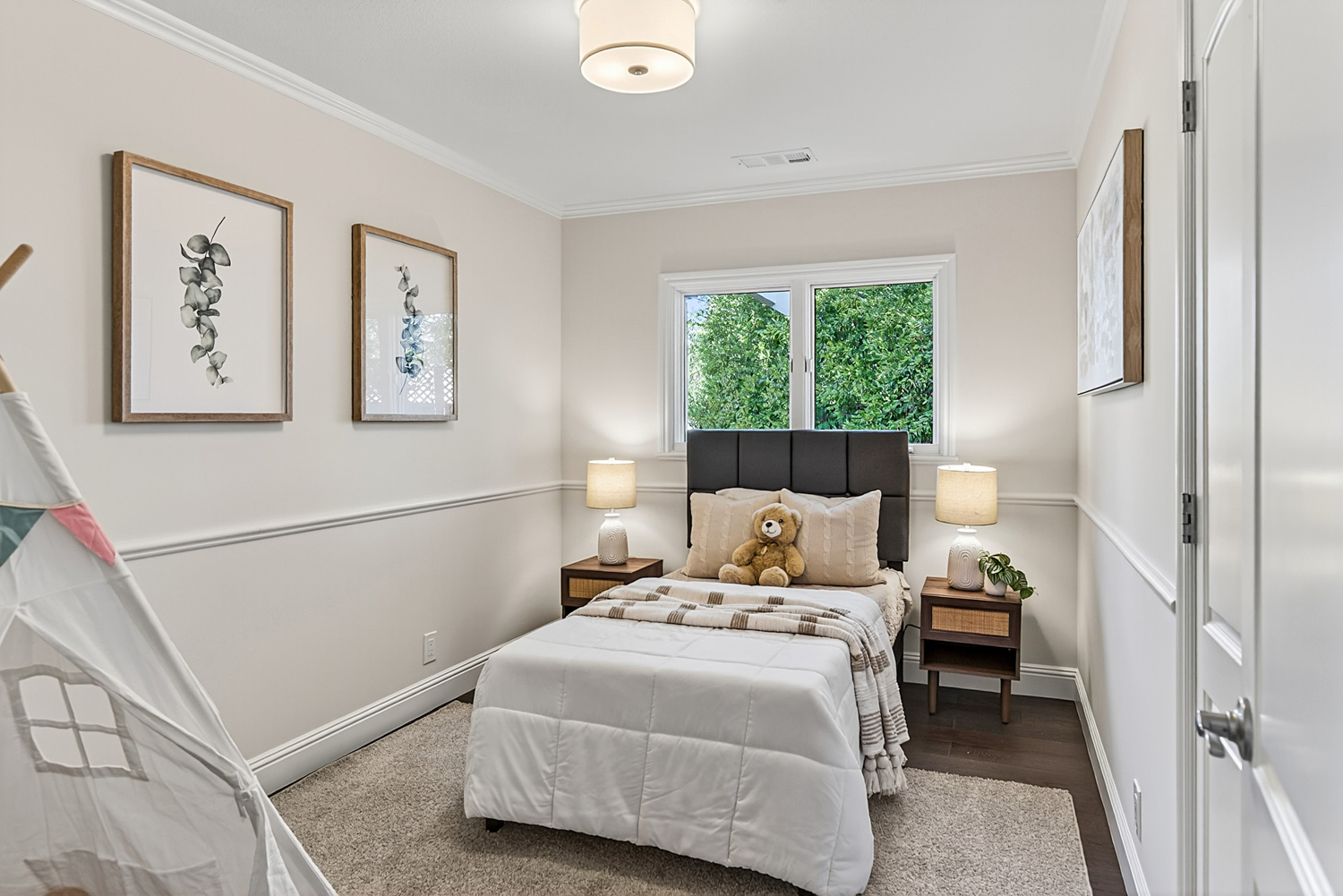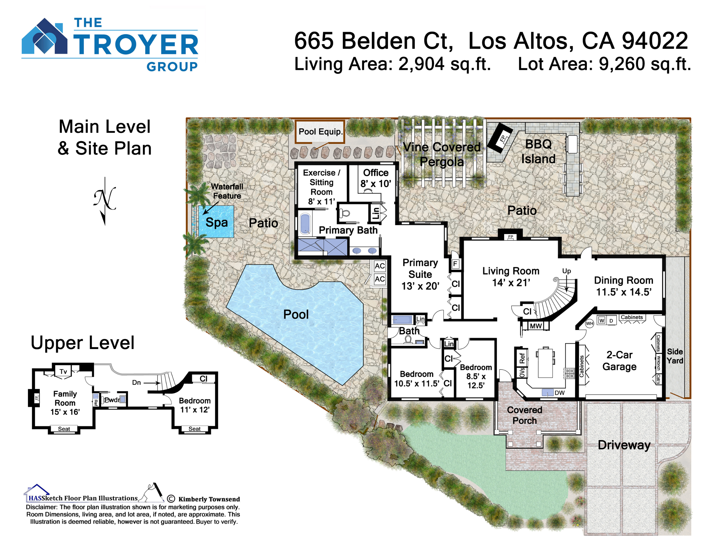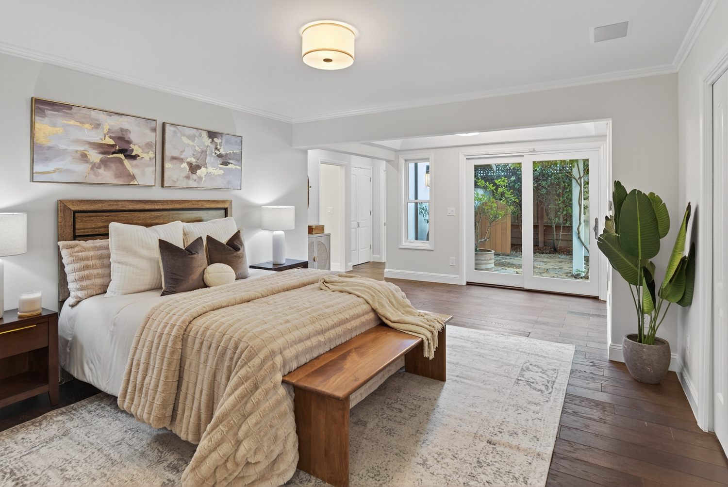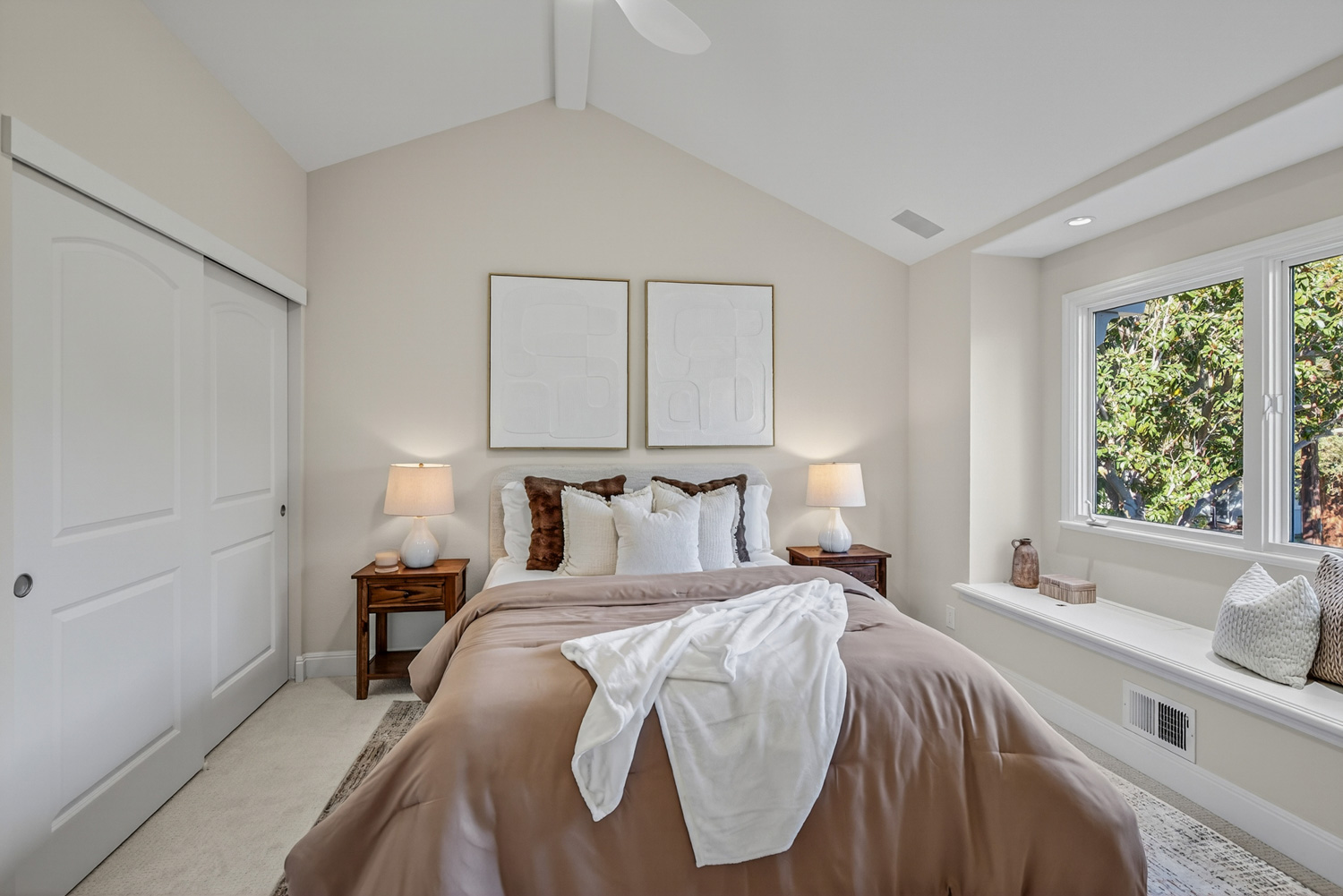 Set at the end of a private cul-de-sac in prime North Los Altos, this timeless home blends classic curb appeal, modern comfort, and low-maintenance, resort-style outdoor spaces. A freshly painted exterior with contrasting trim and a tall peaked front porch welcomes you to the home, and inside deep-hued hardwood floors carry through every spacious room along with high ceilings, abundant light, and thoughtful craftsmanship. The impressive living room centers around a cast-stone fireplace and enjoys soaring two-story ceilings, while the adjoining dining room opens easily to the yard for seamless entertaining. The chef’s kitchen features quartz countertops, a center island, and premium stainless steel appliances. The main level hosts three bedrooms including the incredible primary wing with its own sitting room and office. Upstairs, you have a versatile family room with a fireplace and wet bar, a bedroom, and a bathroom creating ideal guest or media space. The immensely private backyard oasis features multiple flagstone patios that wrap around the home, an extensive barbecue island, fireside patio, and a sparkling pool and spa surrounded by lush greenery. Moments to downtown Los Altos and top-rated schools!
